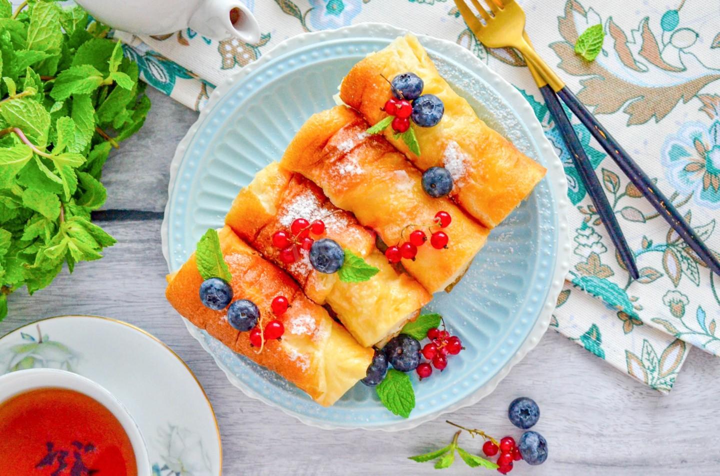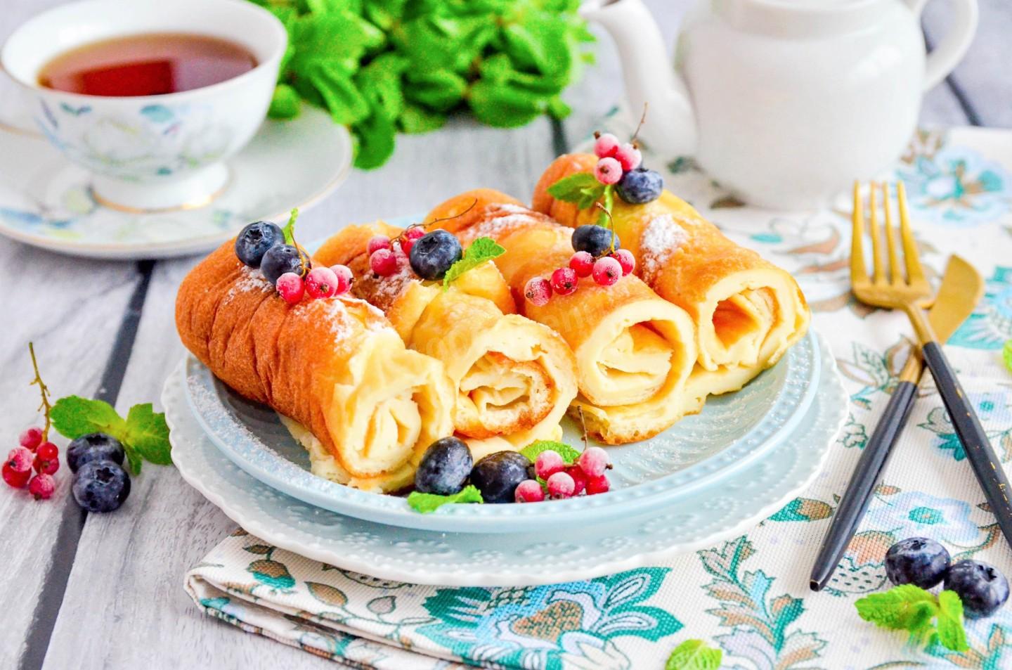 Подавала, нарезав ножницами на порции и свернув их в рулетики. Ели с домашним вареньем — сочетание вышло замечательным. Очень понравилось, что блинчики получились со вкусом бисквита, но при этом не крошатся, а ещё они не жирные! Для меня большой плюс, что не нужно стоять у плиты, рецепт из разряда “всё смешал, и в духовку”.