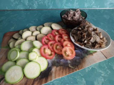 Как сделать мясную запеканку из кабачков баклажанов помидоров с сыром? Подготовьте все необходимые ингредиенты.