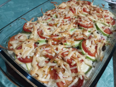 6. Помидор моем, режем тонкими кружочками, выкладываем в форму. Сыр трем на крупной терке, посыпаем сверху.