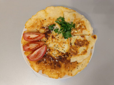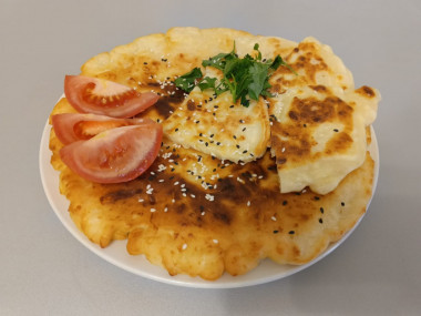 Сделайте маленький огонь, закройте сковороду крышкой и готовьте примерно 10 минут. Поверхность должна схватиться и стать матовой, а низ зарумяниться. Переверните хачапури на другую сторону и готовьте под крышкой еще 7-10 минут, до румяной корочки. Готовый ленивый хачапури на молоке с сыром на сковороде снимите, разрежьте и сразу подавайте. При желании верх можно смазать сливочным или растительным маслом.