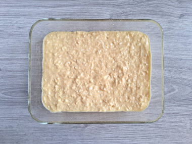 Возьмите подходящую форму для выпечки, у меня керамическая, диаметром 20см. Смажьте ее небольшим количеством масла. Вылейте в форму тесто, слегка потрясите ее, чтобы оно равномерно распределилось. О том, как выбрать форму для запекания, читайте в отдельной статье по ссылке в конце рецепта.