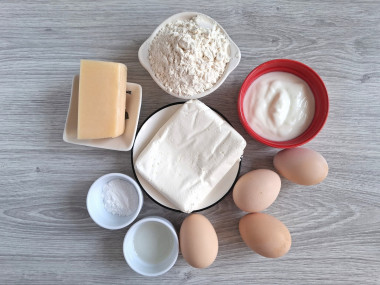 Как сделать ленивые хачапури с сыром и творогом в духовке? Подготовьте продукты. Творог, сметану и сыр берите качественные, натуральные, без заменителей молочного жира. Жирность можете брать любую. Сыр выбирайте тот, который хорошо плавится. Муки может уйти больше или меньше, будете смотреть по тесту.