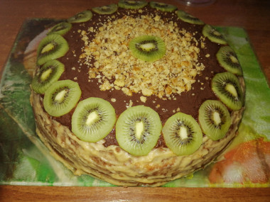 Спасибо за простой и вкусный рецепт! Все делала по рецепту. Самое главное, взбивать яйца с сахаром 10 минут и очень осторожно добавлять муку, чтобы не осели. У меня электрическая духовка. Я выпекала 25 минут при 180 градусах и ещё 20 минут при 160 градусах. Корж пышный, высокий, на 3 части разрезать получилось. И ещё решили украсить торт киви.