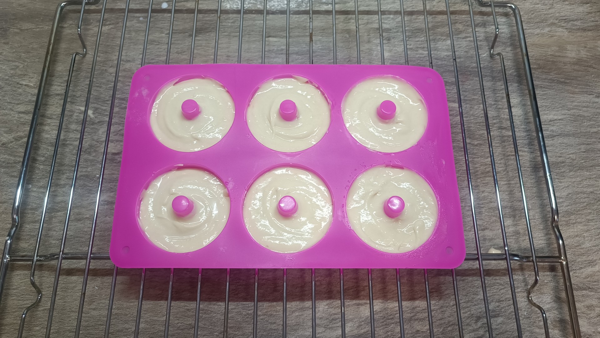 Форму для пончиков смажьте растительным или сливочным маслом. Отсадите тесто в формочки. Это удобно делать с помощью кондитерского мешка. Формочки заполните на 90%, так как в процессе приготовления тесто немного поднимется. Выпекайте в разогретой духовке около 25 минут. Время приготовления зависит от вашей духовки. Ориентируйтесь на особенности работы вашей духовки. Узнать об особенностях работы духовок можно из отдельной статьи, ссылка в конце рецепта.
