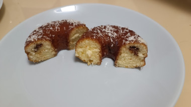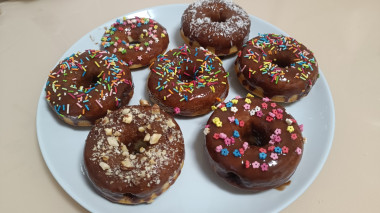 Готовые пончики достаньте из духовки. Остудите. Затем каждый пончик окуните на половину в теплую глазурь. Если глазурь быстро густеет, то добавьте в нее молоко или сливки и подогрейте на малом огне, постоянно перемешивая.