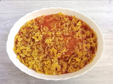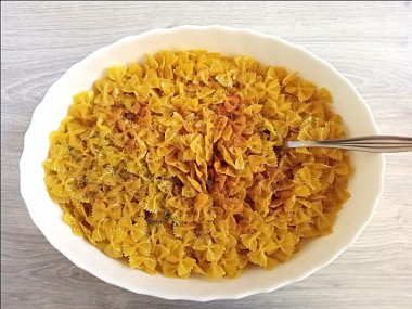 Сразу включите разогреваться духовку, температуру выставите 200°С. Возьмите подходящую форму для запекания. У меня керамическая, размером 23*12см. Высыпьте в нее сухие макароны. Полейте их растительным маслом и перемешайте. О том, как выбрать форму для запекания, читайте в отдельной статье по ссылке в конце рецепта.