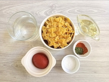 Как сделать макароны в духовке без варки? Подготовьте продукты. Макароны выбирайте короткие, типа рожков, перьев, спиралек. Обращайте внимание на их качество — отдайте предпочтение макаронам из твердых сортов пшеницы. С выбором поможет статья по ссылке в конце рецепта. Кроме перца, вы можете использовать любые другие приправы, у меня сухой базилик.