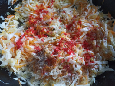 Капусту нашинкуйте тонкими полосками. Я для этого использовала овощерезку. Добавьте капусту в сковороду, посолите по вкусу и посыпьте любимыми специями. У меня в этот раз немного молотой сладкой паприки и чёрный перец.