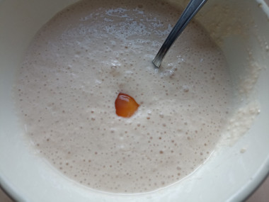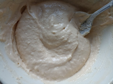 Постепенно добавьте в чашу муку, перемешивая венчиком. Муки вам может потребоваться чуть меньше или наоборот больше, чем указано в рецепте. Ориентируйтесь на то, что тесто должно стать вязким, похожим на тесто для оладий. О муке и её свойствах подробнее можно прочитать в отдельной статье, ссылка в конце рецепта.