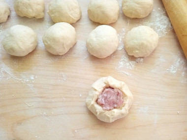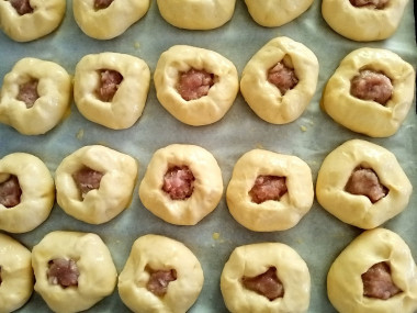 Оставьте беляши расстояться примерно на 15 минут. Включите духовку разогреваться на 180 С. Перед выпечкой смажьте беляши смесью желтка с молоком.