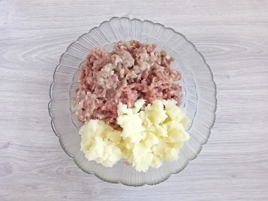 Репчатый лук очистите, натрите на мелкой терке или пропустите через мясорубку вместе с мясом. Вареный картофель также можно пропустить через мясорубку. Выбирайте более удобный для вас вариант. Перемешайте все до получения однородного фарша.