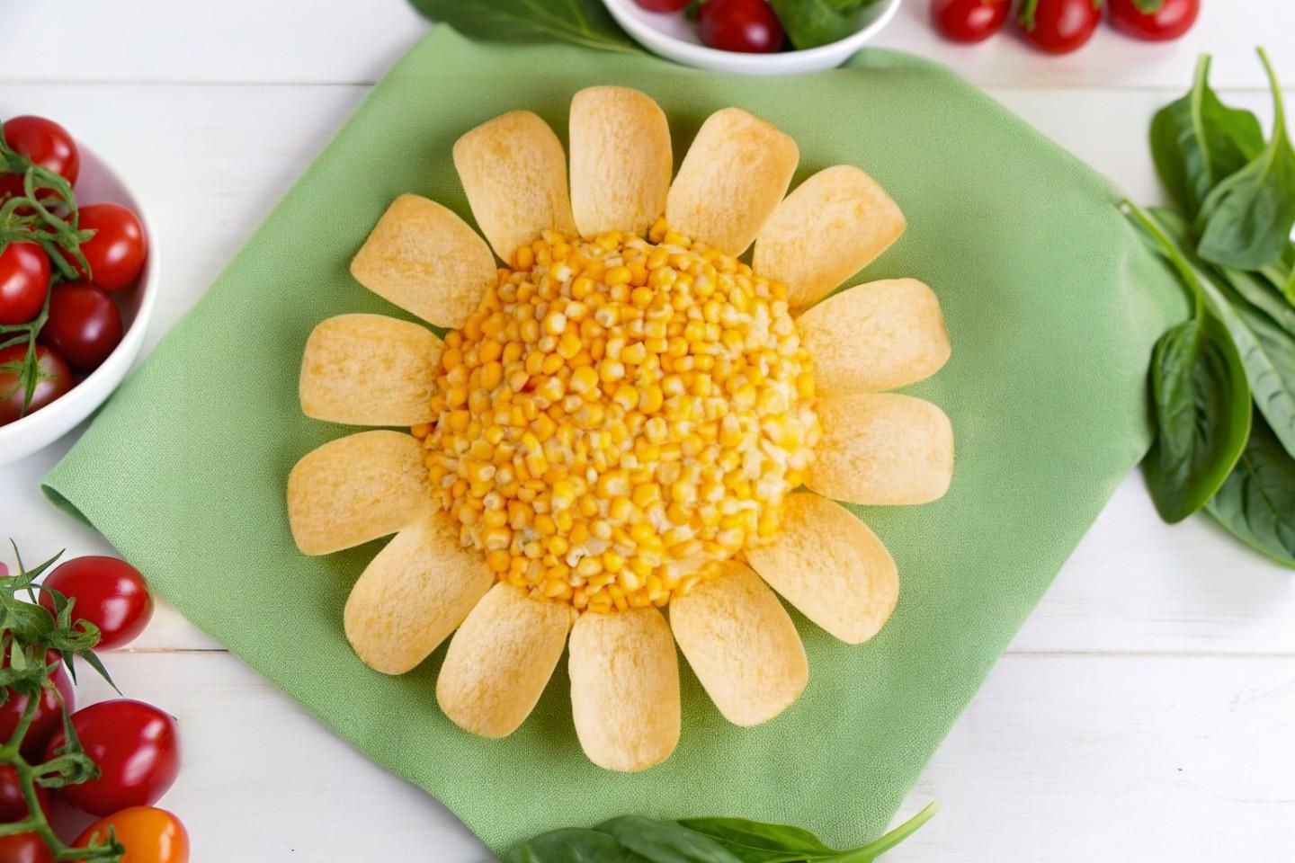 Для украшения традиционно используют кукурузу и чипсы, а из овощей и оливок можно сделать забавное лицо солнышку с глазами и улыбкой. Маслины без косточек, аккуратно разрезанные пополам, создадут восхитительное сходство с семечками настоящего подсолнуха.