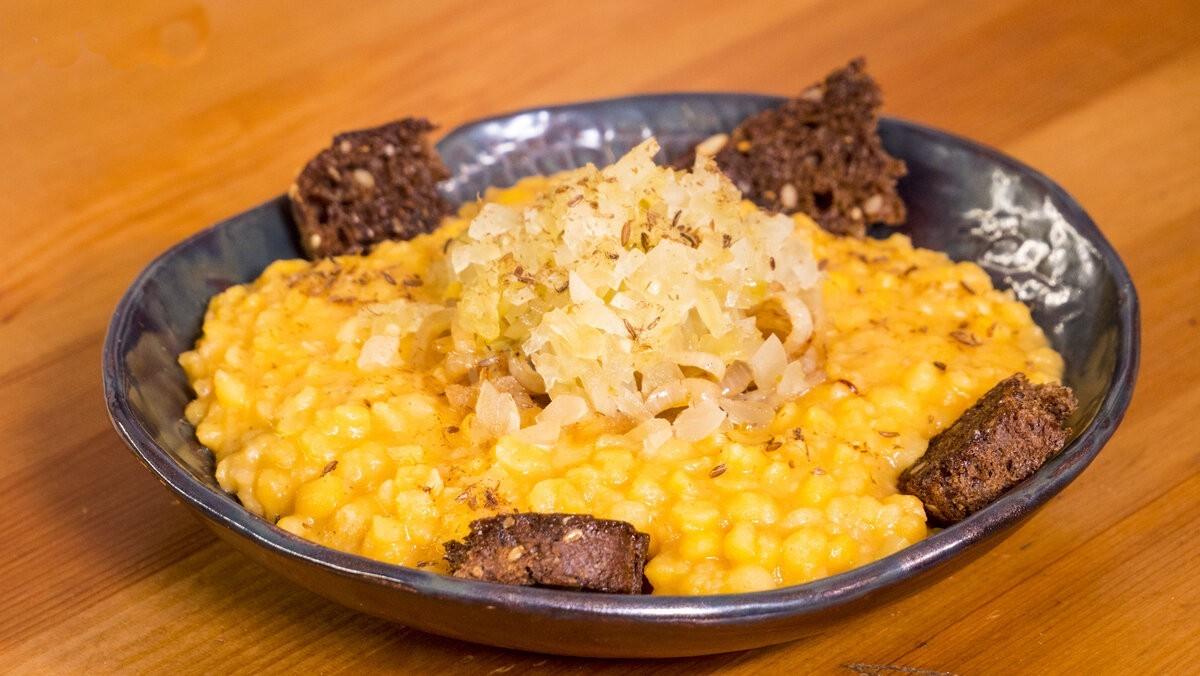 Готовую гороховую кашу выкладываем на тарелку, сверху добавляем жареный лук и оливки.