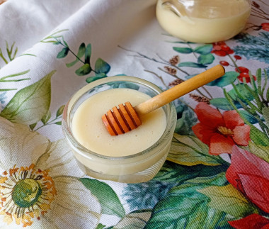 В принципе, десерт уже готов. Но вы можете убрать кремовый мед в холодильник на сутки, а затем взбить его еще раз или даже два. Этим вы точно обезопасите мед от расслаивания. Но если вы планируете съесть лакомство быстро, то можете обойтись одним разом. Готовый мед перелейте в чистую сухую банку.