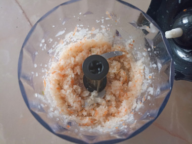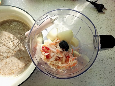 Репчатый лук очистите, крупно нарежьте и положите в чашу блендера вместе с квашеной капустой. Все хорошо измельчите до состояния кашицы.