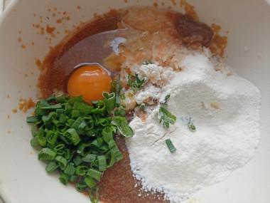 Туда же вбейте яйца и добавьте мелко нашинкованный зеленый лук.