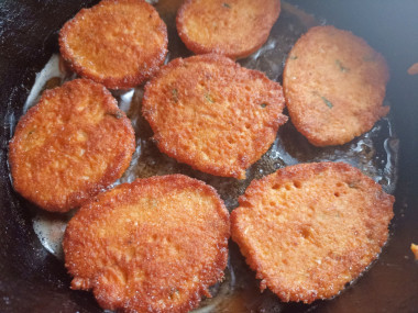 Обжаренные котлеты из икры переложите со сковороды в кастрюлю, добавьте 50 мл воды и тушите в течение 10-15-ти минут под закрытой крышкой.