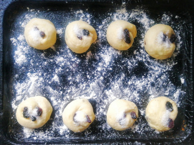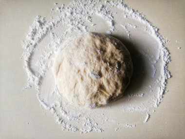 Постепенно добавьте просеянную муку. Её может уйти чуть больше или чуть меньше, ориентируйтесь по консистенции теста. Добавьте помытый и обсушенный изюм. Замесите тесто. Готовое тесто оставьте на расстойку примерно на 1 час.