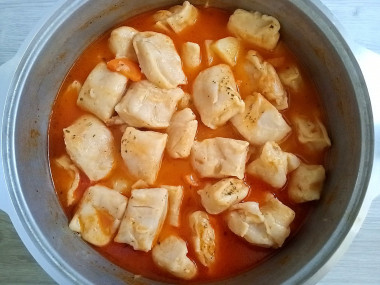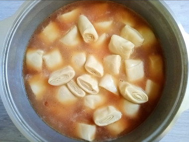 После чего влейте в блюдо кипяток так, чтобы вода практически покрыла продукты. Добавьте томатную пасту, соль и перец. Сверху разложите рулетики из теста.