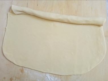 Сверните тесто в рулет. Нарежьте рулет на кусочки длиной около 5см.