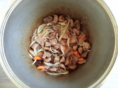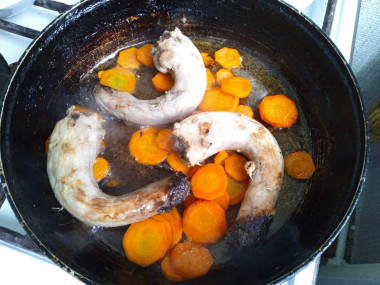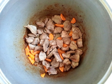 Затем выложите к мясу морковь. Жарьте их вместе 5 минут.
