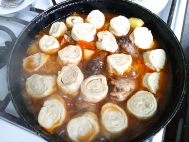 Накройте сковороду крышкой, огонь сделайте минимальным. Тушите блюдо около 40 минут. Вода за это время практически выпарится, а рулетики разбухнут. Точное время зависит от размера кусков мяса, рулетиков из теста, выбранной сковороды и особенностей работы вашей плиты.