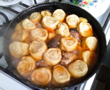 , потушила их, затем добавила все овощи ,все хорошо обжарила добавила кипяточка, чтобы штрудели не утонули, а как бы парились и не открывала крышку пока не почувствовала запах жаренного