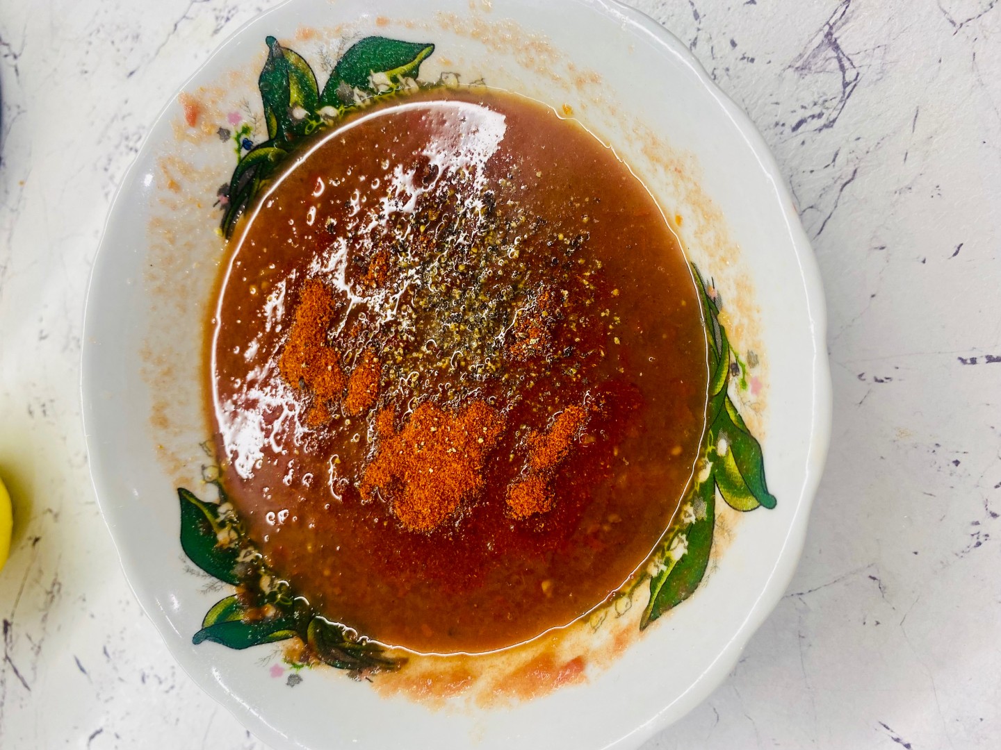 Если соус получился слишком густой, то влейте ещё 1-2 ложки воды. Добавьте в миску специи. Я использовала чёрный и красный молотые перцы, киейнский перец и щепотку кориандра.