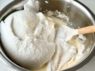 Небольшими порциями, введите в желтки взбитые белки. Аккуратно перемешайте их силиконовой лопаткой до однородности.