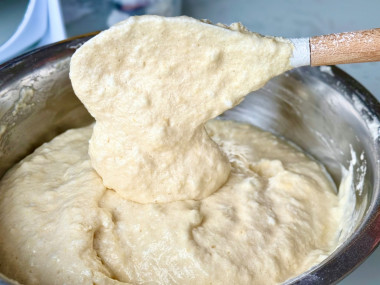 Смешайте муку с разрыхлителем. Просейте смесь к яйцам. Также аккуратно, чтобы не нарушить воздушность белков, вмешайте муку лопаткой. Обо всех нюансах работы с бисквитным тестом читайте после последнего шага.