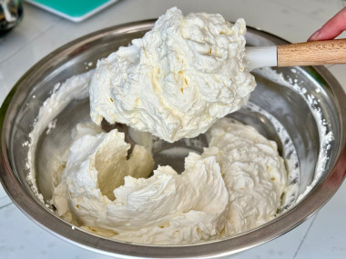 Мне повезло с сыром маскарпоне, он оказался очень густым и плотным по консистенции, поэтому крем вышел очень плотный и хорошо держал форму.