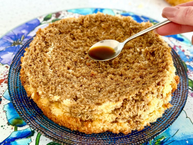 Выложите второй корж. Также хорошо пропитайте его кофе.