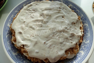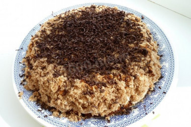 Делала вечером, за ночь отлично пропитался. Верхний корж на небольшие кусочки разломала, а не превращала в крошку) Я, честно говоря, немного боялась за нижний корж, что он выйдет сухим, но ничего подобного - торт действительно тает во рту)
