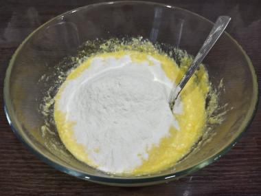 Выложите в миску натертый сыр и тщательно перемешайте тесто.