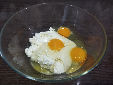 В глубокую миску выложите творог и разомните его вилкой. Если творог комковатый, то можно протереть его через сито. Яйца помойте с подходящим моющим средством. Это избавит скорлупу от загрязнений и бактерий. Вбейте яйца в миску к творогу. Добавьте соль по вкусу. Перемешайте массу вилкой.