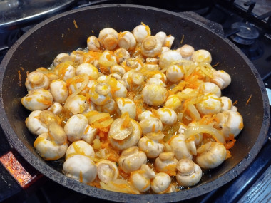Свежие грибы мойте и нарежьте на ломтики. Далее отварите грибы в чуть подсоленной воде до готовности - примерно 5 минут после закипания. Грибы выньте из воды и добавьте к луку и моркови. Тушите все вместе минут 10, помешивая.