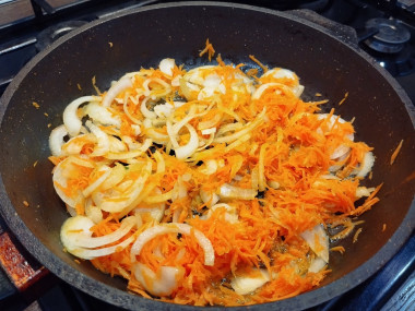 Лук очистите и измельчите ножом, морковку очистите и натрите на терке. Налейте на сковороду растительное масло, прогрейте его, после чего выложите лук и обжарьте его при помешивании в течение примерно 2 минут. Далее добавьте к луку морковку и жарьте все вместе еще примерно 3 минуты также при помешивании.