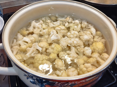 С цветной капусты уберите от листья, помойте её и разберите на соцветия. Если они очень большие, то можно их порезать на кусочки. Отварите соцветия в чуть подсоленной воде до мягкости - примерно 5 минут после закипания. Выньте капусту из воды шумовкой или откиньте на дуршлаг, чтобы стекла лишняя жидкость.