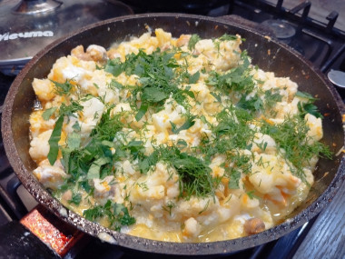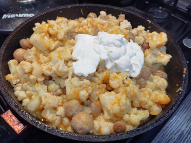 После этого добавьте на сковороду к грибам и овощам цветную капусту. Тушите грибы с цветной капустой до готовности около 20 минут. В конце добавьте соль и перец по вкусу. Положите сметану и сливочное масло. Тушите еще минут пять. В конце добавьте порубленную зелень.