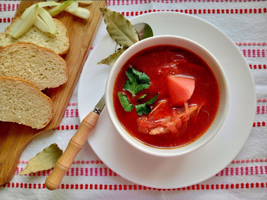 Точно не знаю чем русский борщ со свеклой отличается от других видов борща, но получился он очень вкусным! Муж нахваливал наваристый борщ, а я и рада) Заметила, что готовится он просто, без заморочек. У меня не было говядины, но была половинка тушки кролика. Решила, что кролик не хуже говядины по питательности и сварила борщ из него) Мясо отварила, отделила от костей, а потом отправила в кастрюлю вместе с картошкой и капустой. Пока варился бульон сделала поджарку из лука и моркови. А потом на той же сковородке потушила свеклу с томатом, очень удобно. Дольки чеснока добавила в кастрюлю целыми. В общем то борщ сварился быстро. И он действительно получился таким наваристым и сытным! Любителям сметаны и зелени добавила их в тарелку. Спасибо за простой рецепт вкусного борща!