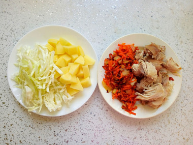 Свежую капусту тонко нашинкуйте. Квашеную отожмите от воды.
