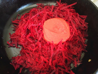 Затем добавьте тертую свеклу и томатную пасту. Обжарьте все вместе еще минут 5.
