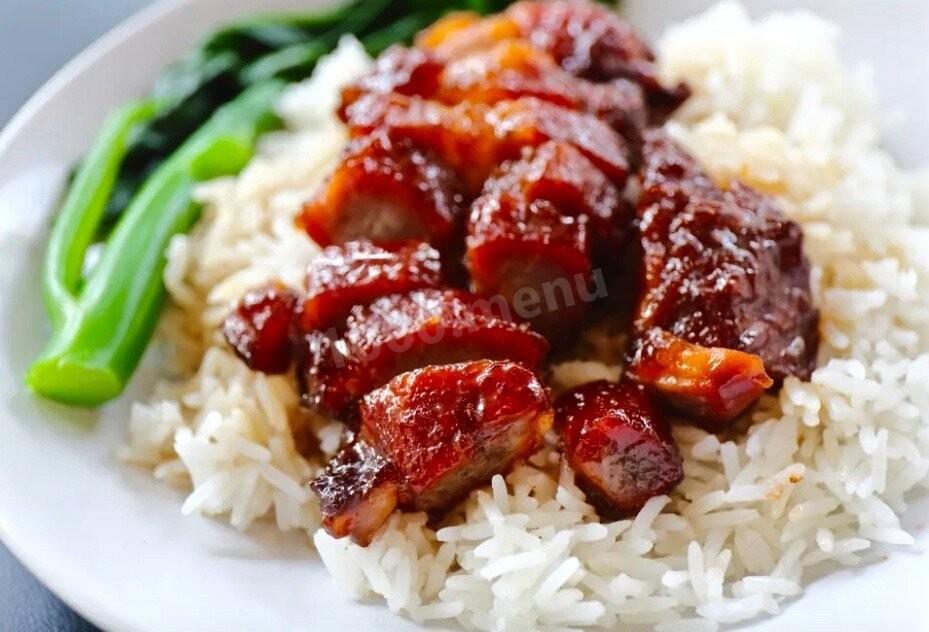 В сотейник выкладываем мясо, добавляем соус хойсин 2 ст. ложки, прибавляем огонь и обжариваем немного, чтоб наши кусочки покрылись ровным карамельным «загаром». И добавляем вино. Доливаем в нашу свинину кипяток так, чтоб практически покрывало мясо. Добавляем порошок имбиря, порошок или стручки сушеного чили, "пять специй", соевый соус и доводим до кипения, уменьшаем огонь меньше среднего и оставляем тушиться на 45 минут. Увеличиваем огонь и выпариваем соус до густого состояния, если он еще не сделал этого сам.