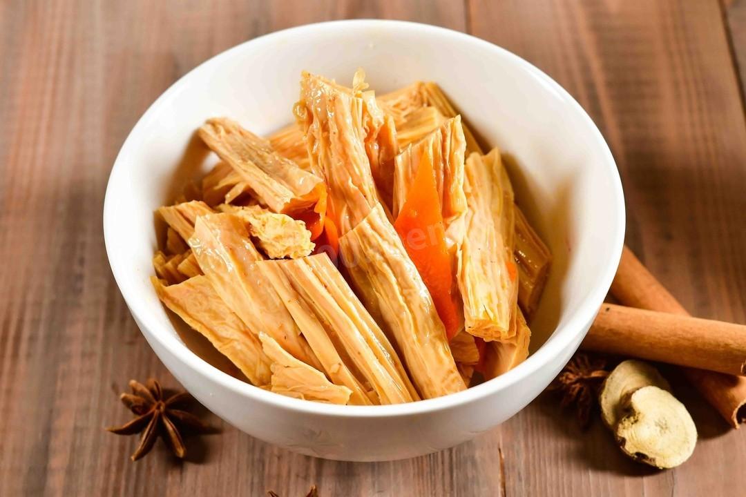 1. Залейте соевую спаржу кипятком, придавите чем-нибудь, чтобы спаржа не всплывала, и вымачивайте в течение 6-12 часов. Можно менять остывшую воду на новый кипяток, чтобы процесс шел быстрее. Попробуйте спаржу: она должна быть равномерно мягкой и легко разжевываться.