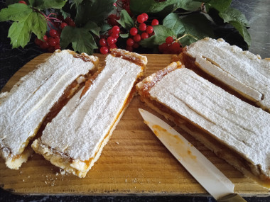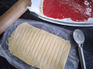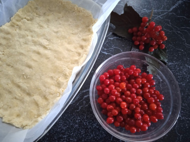 Какой интересный рецепт! Пошла нарвала калину. Решила готовить пирог с калиной без дрожжей. Песочное тесто сделала по описанию в рецепте, только вместо соды положила разрыхлитель, почитав комменты) Ягоды калины у меня упругие, плотные, поэтому я ее уваривала на плите с сахаром до однородности. Очень старалась сделать полосочки для пирога, как на фото, но что-то вышло у меня средненько.