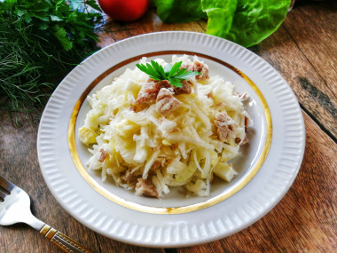 Мясо сварила, остудила, нарезала маленькими кусочками. Дайкон натерла на крупной терке, для того, чтобы салат был сочный. Лук нарезала полукольцами, обжарила на растительном масле до мягкости. Яйца сварила вкрутую, мелко нарезала. Все ингредиенты соединила в глубокой миске, добавила майонез и соль.