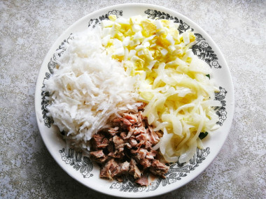 В общей кастрюле соедините все подготовленные ингредиенты: нарезанные редьку, говядину, яйца, жареный и охлажденный лук.