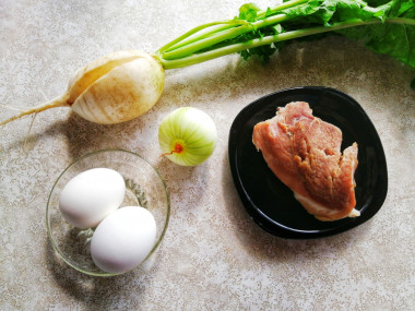 Для салата Ташкент классический из говядины с редькой взяла дайкон, небольшой кусочек свинины, луковицу, два яйца и майонез.
