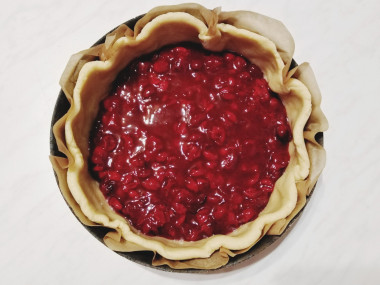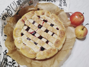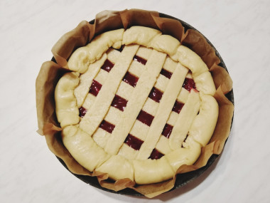 Выложите полоски теста поверх начинки в виде решетки. Тем, кто делает такой пирог впервые, лучше посмотреть видео. Там подробно показано, как это сделать.