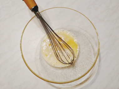 В миске соедините холодное молоко, сахар, ванильный сахар, яйцо, желток и соль. Перемешайте венчиком до однородности.
